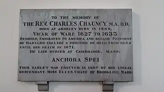 Wall memorial erected in St Mary's Church, Ware, England by Charles Chauncy's direct descendant in 1907