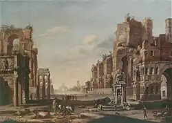 His Utrecht period is characterized by Italianate landscapes and grotto paintings. The seventeenth century Dutch Italianate grotto painting that is characteristic of De Hooch's Utrecht period owes its inception to Cornelis van Poelenbergh of Utrecht. Poelenbergh traveled to the south and, upon his return to Utrecht in the mid-1620s, he continued to depict Italianate landscapes featuring ruins and grottos. De Hooch was most likely involved in initiating this subject matter as an independent genre, along with other followers of Poelenbergh.[13] De Hooch's Italianate landscapes can be clearly associated with those of Poelenburgh and Breenbergh, however it is not known whether he learned about Italianate motifs on a trip south or from Poelenburgh and Breenbergh after they returned to Holland from their own trips to south.[14] De Hooch is known for his intriguing paintings of dramatically lit and spooky grottos which feature classical sculpture and architectural fragments.[14] In his painting Italian landscape with ruins and duck hunters, which is estimated to be completed sometime between 1630 and 1635, a clear connection to the work of Poelenburgh and Breenbergh can be seen. The simple design of the piece and the "solid, monumental composition is accompanied by firmer, more tangible modeling details".[15]