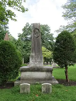 A monument with a tall shaft marks the Evans' graves, the front of which is inscribed with the following tribute to Evans:[43]