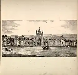Visitors arriving via the main gate on Centre Avenue enter through a large, sandstone, Gothic Revival arch, which was erected in 1852, and pass by the grave of the cemetery's founder, Charles Evans, above-ground crypts, obelisks and other monuments to Civil War-era soldiers and other historical figures from Berks County.[11][12]