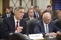 Charles F. McMillan (left) testifies before the United States Senate Committee on Armed Services, Strategic Forces Subcommittee, May 7, 2013. Sandia National Laboratories Director Paul Hommert is to the right.