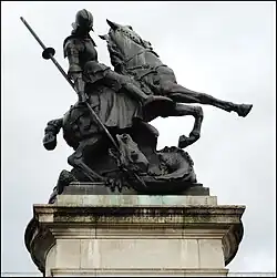 - St Mary-le-bone War Memorial, Lord's Roundabout, St John's Wood, City of Westminster, London NW8: an equestrian St George in the act of dragon-slaying with two relief panels on the stone plinth showing 'Peace' and 'Justice'. Hartwell took on the commission in 1923 after Alfred Drury had withdrawn. Another version at Eldon Square, Newcastle upon Tyne.[2]