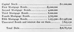 Proceedings were begun by the trustees of the fourth mortgage, default having also been made on the first, second, third, and fifth mortgages. On motion thus made, Nathaniel Marsh, Secretary of the company, was appointed Receiver by Judge Mason of Chenango County. He took possession of the road on August 16, 1859. On the 19th the Directors made a large reduction in President Moran's salary. On the 27th he resigned as president, and retired from the Directory. Samuel Marsh was elected president to succeed him. When Moran left the capital stock of the company was $11,000,000 and the bonded debt $36,783,650 (see image).[15]