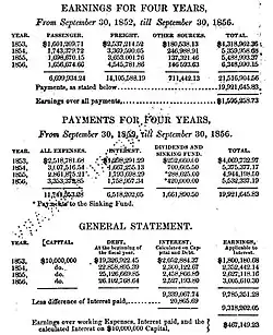 - "The 30 September 1856, marks the culminating point in the success of the Company. The road was good, and its equipments in cars, locomotives and every thing necessary for doing a large business, were nearly all that could be desired. From thence, its decline may be dated. The old and experienced enginemen were at that time discharged. Those substituted for them, though competent and careful, could not at once run the trains as economically as had before been usual. But they acquitted themselves well. No accident happened to car or passenger in the months of October, November and December; and the earnings of the road for that period, being the first quarter of the fiscal year ending September 30, 1857, amounted to $1,605,582.42, a. sum which with one exception had never been exceeded in the same quarter. It left, after paying all working expenses and interest on the bonded and floating debt, as net surplus earnings, $207,447.53. After this, the real decline began, with a hard winter, destructive spring freshets, and imaginary improvements by a new President..."[14]