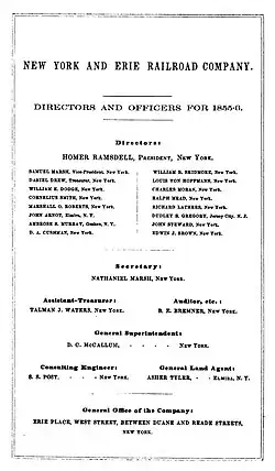 In 1854 Charles Moran, broker and private banker, and Louis Von Hoffman, private banker, both from New York City,[5] were elected among the sixteen directors of the New York and Erie Company. This election was in recognition of the interests of foreign creditors of the company, Moran having placed a large amount of the company's unsecured, or income, bonds in Switzerland and other parts of Europe.[6] Moran would soon become one of Homer Ramsdell's confidant.