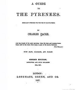 In 1862 Packe's A Guide to the Pyrenees (with the subtitle Especially Intended for the Use of Mountaineers) was first published;[1] the second edition was brought out by the London firm of Longmans, Green, and Co.[2]