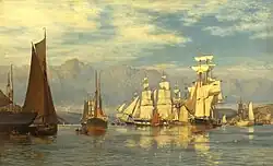 His first works were studies of scenery in Somerset and Devon. He first exhibited in London, at the Suffolk Street Galleries, in 1853, a picture called “The Mumbles Head, Glamorganshire.” His first contribution to the Royal Academy was “Durham from the North,” in 1857. This was succeeded by “A Bit of Riverside,” in 1858. “The Stone Walls of Old England—Speeton Cliffs, Yorkshire,” in 1861, was a noted work. Altogether, he exhibited some 110 pictures in London, mostly views of the coast, noted for the drawing of waves, rigging, and hulls of ships, and for the study of cloud and light effects.