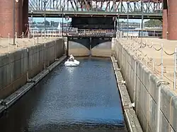 ![]() Charles River Dam. Pump building is on the left, locks are towards the right. | |