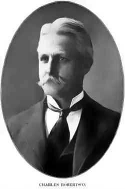 Charles Robertson was born to parents Dr. William Robertson (1803 -1880) and Nancy Robertson, née Halliday (b.1821), married October 18, 1842. His father, William, was a physician turned farmer and general merchandiser, and his mother, Nancy, was the daughter of a reverend. Charles married Alice McDonald Venable in November 1879 and they had one child, Mary.[1] Robertson died 17 June 1935 in Carlinville, Illinois. [2]
