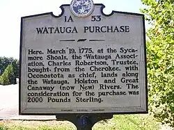 As Clerk who was appointed Trustee for the Watauga Association, Charles Robertson bought the property from the Cherokee for the sum of 2,000 British Pounds.[2] Previously, the association had leased the property including the settlements from the Cherokee. The Charles Robertson purchase from the Cherokee was mirrored a few days later by Jacob Brown for the adjacent Nolichucky Grants.