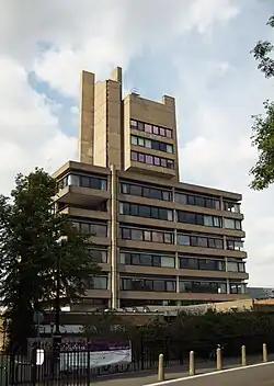 The Charles Wilson Building at the University of Leicester was designed by Sir Denys Lasdun in the brutalist style, and completed in 1963.[7] It is Category B listed.[7] It is the university's main social and catering building, and is licensed as a venue for civil weddings and civil partnerships.[8]