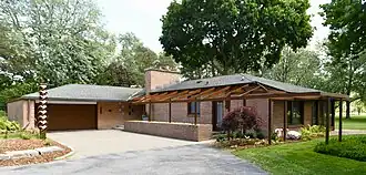 The Charles Penhaligen House is a single-story, hip-roofed, L-plan brick house with wood trim. It is set well back from the road on a cul d'sac in a residential neighborhood. It has a drive paralleling the long axis of the house and ending at a two-car garage, nestled into a gentle hill. A large chimney protrudes from the roof at the junction of the garage with the main house. The front facade is relatively blank, broken only by a window and kitchen door. The facade is separated from the drive by a brick planter, and a trellis-like extension of the roofline shelters the raised terrace behind the planter. The rear of the house looks out over the golf course, and contains wrap-around windows.[2]