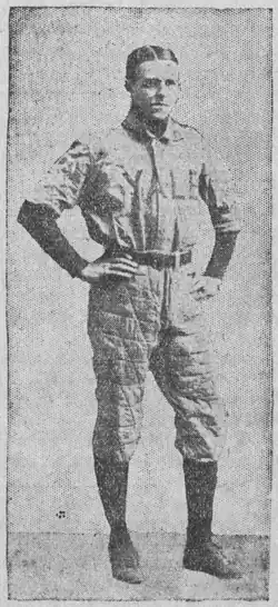 A native of South Bethlehem, Pennsylvania, de Saulles attended the Lawrenceville School where he was captain of both the football and baseball teams.[1] DeSaulles was five-feet, eight inches tall and weighed 151 pounds.[1] De Saulles enrolled at Yale University where he played quarterback for the football team in 1897 and 1898 and was selected for the 1897 College Football All-America Team.[2][3] He was also the captain of Yale's baseball team.[1] Jim Rodgers, the captain of the 1897 Yale football team, credited de Saulles with Yale's victory over Princeton in 1897: "I have always claimed that Charlie de Saulles put the Yale '97 team on the map. Charlie de Saulles with his three wonderful runs, which averaged not less than 60 yards each, really brought about the victory."[4] In his book "Football Days," William Hanford Edwards, who played on the Princeton line in that game, wrote of de Saulles: "De Saulles' open field work was remarkable. I remember well the great run of fifty-five yards which he made. He was a wonderfully clever dodger and used the stiff arm well.[5] Charles Ives wrote a song about this football game titled simply Yale-Princeton Football Game.