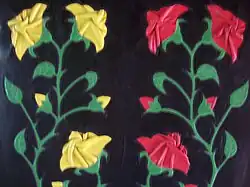 Almost any design imaginable appears on a Charlie boot—oil derricks, animals, names, initials, logos, scenes, just about everything was sketched and worked into the upper and, less frequently, the lower foot. Charlie's signature design, dating to the pair he built "on spec" that Ernest Tubb bought, was the inlaid rose. It began, as did all of his creations, with a detailed sketch. He liked to work from life, so he used actual roses to inspire his design, and Charlie's immense artistic skill allowed the design to bloom. Drawing an intricate rose the size of a quarter is one thing; figuring how to create it out of leather, in-lay it in proportion on the boot, was quite another. So difficult and unique was this design, Charlie kept the process secret for decades, until he passed along the secrets to Miller.[49]