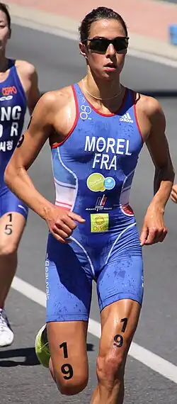 Having finished the local collège in Draguignan in 2004, Morel was admitted to the triathlon section of the Pôle Espoir CREPS PACA, a high performance centre situated in a small pine forest in Boulouris close to St. Raphael which closely collaborates with the Lycée Saint Exupery, a high school in St. Raphael. Since then, and up to now, Pierre Houseaux has been Morel's trainer and she still lives in Boulouris (Aigue Bonne) even though she joined the triathlon club of Beauvais in 2006 and, like the well-known triathletes Sylvain Sudrie, Laurent Vidal, Emmie Charayron and Delphine Pelletier, she enrolled at the Military School Ecole d’application d’infanterie (= EAI), then in Montpellier, in December 2007 (grade: soldat 1re classe; 2012: caporal). In 2008 Moreland her EAI team won the gold medal at the Military World Championships in Estonia, in the individual ranking Morel placed 5th. At the Military World Championships 2011 in Rio de Janeiro (24 July 2011) Morel placed 5th again, the French female team placed fourth and the French mixed team won the gold medal. [1] In 2012, Morel won the bronze medal at the Military Triathlon World Championship in Lausanne (25 August 2012).