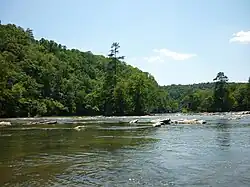 The name Chattahoochee is thought to come from a Muskogee word meaning "rocks-marked" (or "painted"), from chato ("rock") plus huchi ("marked").[3] This possibly refers to the many colorful granite outcroppings along the northeast-to-southwest segment of the river. Much of that segment of the river runs through the Brevard fault zone.
