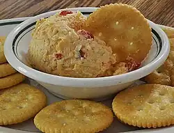 In the United States, beer cheese spread is a traditional food of the U.S. state of Kentucky.[11][12] Pimento cheese is a food in the cuisine of the Southern United States that has been referred to as the "pâté of the south" and "Carolina caviar".[13][14][15][16][17] Port wine cheese is mass-produced in the United States under several brands.[18][19] Pub cheese is a soft cheese spread that is a traditional bar snack in the United States.[20] Additional U.S. cheese spreads include benedictine, cold pack cheese and cup cheese.[21][22] A cheese ball is a type of cheese spread.[23][24][25]
