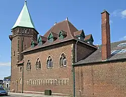 On 1 June 1899 all the Volunteer artillery units became part of the Royal Garrison Artillery (RGA) and with the abolition of the RA's divisional organisation on 1 January 1902 the unit became the 1st Cheshire and Carnarvonshire RGA (Volunteers). The HQ was at County Buildings, Old Prison Yard, Shipgate Street, Chester.[4][6][10][11] In 1904, the Carnavonshire companies were separated to form their own 1st Carnarvonshire RGA (V).[4][5]