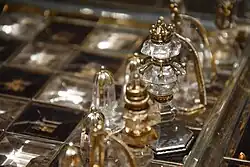 A chess set consists of a chessboard and white and black chess pieces for playing chess.[1] There are sixteen pieces of each color: one king, one queen, two rooks, two bishops, two knights, and eight pawns. Extra pieces may be provided for use in promotion, most commonly one extra queen per color. Chess boxes, chess clocks, and chess tables are common pieces of chess equipment used alongside chess sets. Chess sets are made in a wide variety of styles, sometimes for ornamental rather than practical purposes. For tournament play, the Staunton chess set is preferred and, in some cases, required.