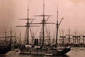 The Chilean corvette Chacabuco was a late 19th-century ship of the Chilean Navy. Commanded by Enrique Simpson in the early 1870s, the ship participated in the exploration of the fjords and archipelagoes of Aysén Region in northern Patagonia.[2] These travels led to the re-discovery of San Rafael Lake and the establishment of Aysén Fjord as the principal access to the inland of Aysén Region.[2] In 1876 Chacabuco transported governor of Magallanes Diego Dublé Almeyda to the Falkland Islands bringing back sheep, thus initiating the Patagonian sheep farming boom of the late 19th century.[3] From 1879 onwards the corvette fought in the War of the Pacific.