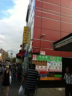 New York City's satellite Chinatowns in Queens, as well as in Brooklyn, are thriving as traditionally urban enclaves, as large-scale Chinese immigration into New York continues,[48][49][50][51] with the largest metropolitan Chinese population outside Asia.[52] busy intersection of Main Street, Kissena Boulevard, and 41st Avenue in the Flushing Chinatown (法拉盛華埠), in Queens. The segment of Main Street between Kissena Boulevard and Roosevelt Avenue, punctuated by the Long Island Rail Road trestle overpass, represents the cultural heart of Flushing Chinatown. Housing more than 30,000 individuals born in China alone, the largest by this metric outside Asia, Flushing is home to one of the largest and fastest-growing Chinatowns in the world.[46] Massage parlors in the Flushing Chinatown have become the hub of organized prostitution in the United States.[53]