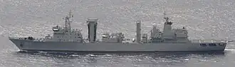 Type 903 integrated supply ship (NATO called Fuchi-class supply ship) is a new large-scale integrated supply ship of the Chinese People's Liberation Army Navy, designed by Zhang Wende. The later improved model is called 903A. The difference with 903 is that the displacement has increased from 20,530 tons to 23,000 tons.[2]