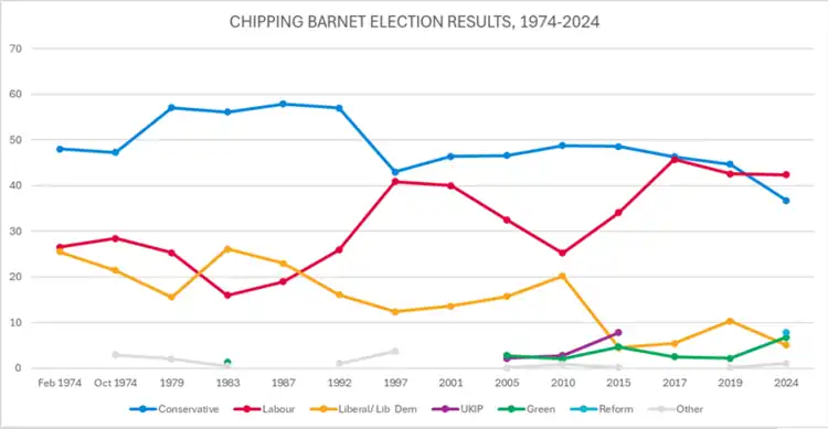 The seat was held by a Conservative after its creation for the February 1974 general election , and withstood the Labour landslide in 1997 by just over 2% (1,035 votes). However, this would come to a close after the 2024 general election , when Chipping Barnet was won by the Labour Party; it was the first time in the constituency's history that it was not represented by a Conservative MP.