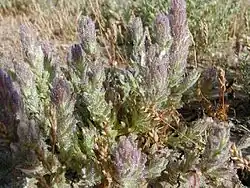 Chloropyron palmatum is an annual herb[13] growing 10 to 30 centimeters tall. Its leaves are gray-green in color, up to 18 millimeters long, and usually irregularly toothed, although the lower leaves can be entire.[14]