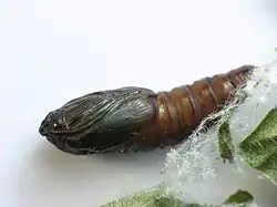 The caterpillar is green with a black head. The adult is a small, light brown moth.