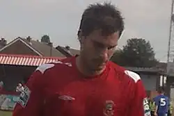 He started 2002–03 well, taking his place in the team due to injuries to other players.[25] He made his first appearance in the opening match, a 1–1 draw away to Macclesfield Town on 10 August 2002, with chairman John Batchelor claiming Smith had a "wonderful game and if we can get that sort of attitude from everyone in the team we won't have any problems".[27] Smith was dropped to the bench for a 1–1 home draw with Wrexham on 29 October 2002 due to a change in formation, having started every match in 2002–03 prior to this match, although he did play as a 48th-minute substitute.[28] He suffered a hamstring injury in early-November 2002,[29] making his return in a 1–0 victory away to Rochdale on 23 November.[30] Smith received his first red card of 2002–03 for a second bookable offence in a 1–1 home draw with Hull City on 28 December 2002, resulting in a one-match suspension.[31] This meant he missed York's match against Torquay on 11 January 2003, and after a short spell on the sidelines returned in a 2–1 home win over Macclesfield on 2 February.[30][31][32] Smith finished 2002–03 with 39 appearances for York,[30] and was described by the Evening Press as the "surprise star of the season".[33] Despite being in outstanding form and becoming a fans' favourite,[34] he was not offered a new contract with York at the end of 2002–03 by Dolan, although he hoped to still to have a future at the club.[35] This decision was reversed by newly appointed player-manager Chris Brass, and Smith signed a new one-year contract in July 2003.[36]