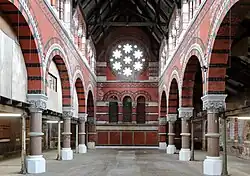 The church is in North Italian Romanesque style, and constructed in common brick with polychromatic decoration in red and blue brick and stone, inside and outside the building. There is a tall northwest tower, almost detached, which originally had a pyramidal roof. All the windows are round-headed, other than a large round window in the west end. Inside the church, the arcades have round arches and are carried on granite piers with Byzantine capitals. All the fittings have been removed apart from the reredos which consists of an arcade. Remnants of the Audsley stained glass have survived.[2]
