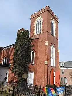 The church itself takes the form of a traditional English parish church, with an engaged tower and transept at the three-quarters point, built of red brick. The front facade is currently covered with a heavy growth of ivy. The tower and turrets at the east front and north transept are castellated. Limestone, sandstone and molded brick are used for the various decorative elements in the facade. An iron fence encloses the small churchyard, and a chapel has been added to the south wing.[2]