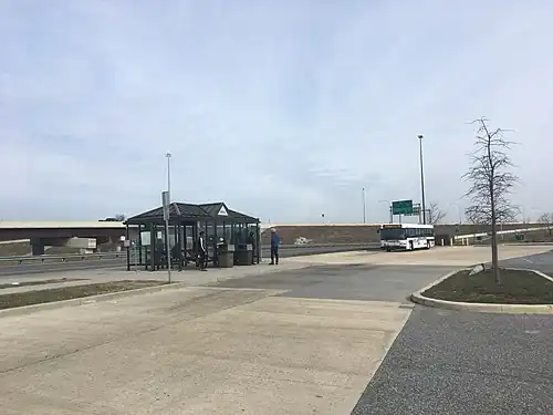 The Christiana Mall Park & Ride is located at the Christiana Mall, a shopping mall located southeast of the interchange between Interstate 95 and Delaware Route 1/Delaware Route 7 in the unincorporated community of Christiana, situated between Wilmington and Newark in northern New Castle County, Delaware.[1][2] The park and ride is located in the parking lot of the mall on the west side near Nordstrom. The Christiana Mall Park & Ride consists of a bus shelter with benches, bus schedules, and trash cans adjacent to the roadway. A sidewalk connects the park and ride to the mall entrance near Nordstrom.[2] The parking spaces for the park and ride are located in the mall's parking lot, with yellow paint used to delineate the park and ride area.[3]