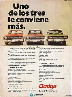 - ^ After Chrysler closed its Argentine subsidiary, production of the model was resumed by recently formed "Volkswagen Argentina", which rebranded it as "Volkswagen 1500", producing it until 1990.