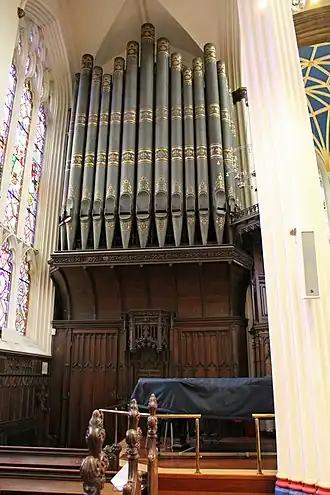 The nineteenth century saw the reintroduction of accompanied music into the Church of Scotland. This was strongly influenced by the English Oxford Movement, which encouraged a return to Medieval forms of architecture and worship. The first organ to be installed by a Church of Scotland church after the Reformation was at St. Andrews, Glasgow in 1804, but it was not in the church building and was used only for weekly rehearsals. Two years later the city council was petitioned to allow it to be moved into the church, but they deferred to the local presbytery, who decided, after much deliberation, that they were illegal and prohibited their use within their jurisdiction. In 1828 the first organ was controversially installed in an Edinburgh church. Around the same time James Steven published his Harmonia Sacra: A Selection of the Most Approved Psalm and Hymn Tunes, provocatively printed a frontispiece showing a small organ.[31] The Church Service Society was founded in 1865 to promote liturgical study and reform and a year later organs were officially admitted to churches.[32] They began to be added to churches in large numbers and by the end of the century roughly a third of Church of Scotland ministers were members of the society and over 80 per cent of kirks had both organs and choirs. However, they remained controversial, with considerable opposition among conservative elements within the church[33] and organs were never placed in some churches.[31]