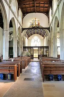 Though the nave is relatively short, being only four bays in length, it is tall, which adds to the sense of scale and space. The nave arcade is lofty, on top of which is the clerestory, and above that a fine tie-beam timber roof. The roof is supported on corbels that project outwards from the clerestory walls. The line of the former nave roof can still be seen etched on the tower arch. The tower is lit by a large five-light stained glass window, above which is a highly decorative fan vault, a hallmark of the Perpendicular style. The nave itself is lit by four large four-light windows in each aisle and the three-light clerestory windows.[1][2][11]