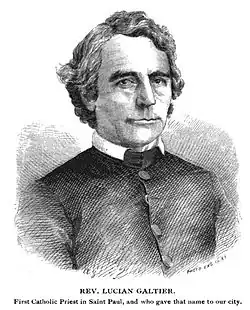 The first parish established in the town was named St. John the Evangelist and was founded in 1844 by Rev. Lucien Galtier, who was named the first pastor in Keokuk. The church was a log structure built on the corner of Second and Blondeau Streets. The church was built by Hugh V. Gildea from Dubuque with the help of Father Galtier. A future historian of Keokuk, Virginia Wilcox Ivins, remembered seeing the "elegant" priest hammering on the church roof on a hot July day when she was twelve years old. The church building measured 20-by-30-foot (6.1 by 9.1 m) and was 12 feet (4 m) high. It cost $598.37, and was paid for from funds received from the Society of the Propagation of the Faith.[3] Galtier stayed only a few months, and Father Alleman had care of the Keokuk parish again. The Rev. Jean Villars became its pastor in 1848 and he stayed for nine years. The Rev. William Emonds was sent to Keokuk in 1855 to buy back property lost by the church. Instead, he bought new property on which St. Peter's Church was founded. By now there were quite a few German Catholics in Keokuk, who had immigrated after the 1848 Revolutions, and they wanted a priest who spoke their language. After 1857 St. Peter's became the only Catholic church in Keokuk. St. John the Evangelist was abandoned and Father Villars recalled. The cornerstone was laid for the original church on Exchange Street between Ninth and Tenth Streets on April 20, 1856.