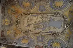 The vaulted-ceiling roof is painted with the Triumph of Our Lady of the Conception (Triunfo de Nossa Senhora da Conceição), and includes molded and framed elements, as well as the signet of the Virgin Mary. This figurative and symbolic ceiling, in blue, gold and ocre, depicts figures of an angel with lance killing a dragon over a globe. The Virgin is located over a lunar crescent, crowned by stars, being blessed by God, with clouds and the heads of angels filling in the rest. The main scene is framed by architectural motifs, heads of angels selectively placed in the cardinal directions, and arches forming an architectural frieze. Outside the medallion is decorated by florians, with their centres opened to vegetable motifs (mainly leaves), with the area above the presbytery the most decorated. Here there is an inscribed "M" and crown. Between the arches are other representations: an angel with a scale in his right hand, and sword in the other; angels with flowers; angels with trumpets; the sun; and an angel guarding a thurible in its right hand, with flores surrounding the group.[1]