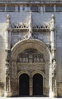 The tympanum has two registers. On the first there are two inverted semi-circles with decorations (urns, cornucopias and animal figures). Tangent to the arches of the doorways are medallions with classical bust, while on the periphery there are relief imagery. The second register, semi-circular, holds a sculptured group of figures that represents the classical Misericórdia symbol, or Mater Omnium, over a frieze with elevated platform consisting of semi-circular dietes. On this platform is the Virgin Mary, secured by two angels, over figures representing Pope Alexander VI, Father Miguel Contreiras, a bishop and cardinal (all on the right), and Queen Eleonor, King Manuel and two prelated (on the left).[1][2]