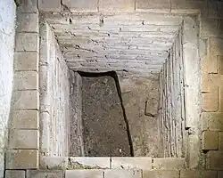 The church has a rectangular plan with a small nave, chancel, and two sacristies. The nave is 10 metres (33 ft) long and 6.5 metres (21 ft) wide; the chancel is a further 6 metres (20 ft) deep. The church floor has numerous gravestones. The sacristies and chancel are connected by entrance doors and rectangular windows with lattice screens. The chancel arch is 3.5 metres (11 ft) high, and is surmounted by an inscription that reads: Tota pulcha, es Maria, or "You are completely beautiful, Mary", a reference to the Immaculate Conception. The pulpit of the nave has a lion, sculpted in stone, at the base of the pulpit; it was damaged by fortune hunters.[2][6]