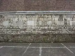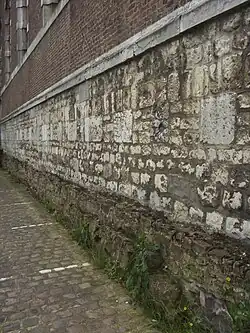 The chancel of the third edifice probably dates back to the middle of the 17th century.[22] This church is eight times bigger than the first. The chancel is of a pentagonal design 8.25 metres (9.02 yd) deep. It is consolidated by four buttresses, suggesting that it was once covered by a solid vault, probably of gothic design. The nave, 22 metres (24 yd) long and of an estimated width of 20 metres (22 yd), is slightly trapezium-shaped[23] and has two aisles. The scale of the aisles is evocative of the hall church type, like many that existed in Hainault in the 15th and 16th century.