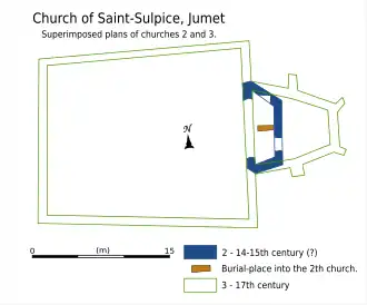 During the excavation, the sole trace of the second church — the foundation of an irregular three-sided apse— was found. How the building was constructed toward the narthex remains unclear. However, it is known that this side ended with a tower because Jehan Camal, the local priest, bequeathed 50 livres towards the repairing of the tower and the installation of a bell in his will of 1517.[16] This tower is probably the same one mentioned in the 17th century, which was demolished for the construction of the 18th century church.[17] The size of the choir/chancel suggests a three-apsed construction, maybe similar to the third church.[18] As well as the main altar, a Pouillé ecclesiastical register from 1445 mentioned an altar devoted to Saint Nicholas, and another from 1518 mentions an altar devoted to the Virgin Mary.[19]