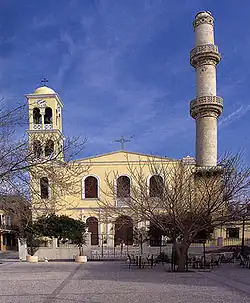 The Church of Saint Nicholas (Greek: Ιερός Ναός Αγίου Νικολάου) is a Greek Orthodox church located in the Splanzia square in the town of Chania, Crete, Greece. It is dedicated to Saint Nicholas. Originally a Catholic church, it was converted into a mosque during the Ottoman period and then back into a church in the twentieth century. It is the only building in Greece to possess both a bell tower and a minaret.