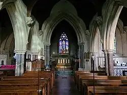 The church's wooden fittings were carved from oak sourced from Fairfield, the estate of Sir Acland. Many of them, including the pews, pulpit, reading desk, reredos and stalls in the chancel, were carved by Mr. Davis of Taunton. The octagonal font belonged to the previous church and dates to the 12th century.[3] The carving of the interior stone corbels was carried out by Farmer of London. The passages of the nave was laid with Minton's tiles and the chancel laid with Minton's encaustic tiles. The stained glass windows in the chancel and north chapel were by O'Connor of London, and the small stained glass window in the baptistry by Messrs Hardman of Birmingham. The organ was supplied by Walker of London.[5][4]