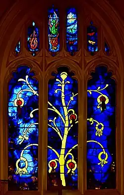 A highlight of the church is the Tree of Life window in the east chancel, designed by John Piper and made by Patrick Reyntiens in 1970–71, serving as a modern contrast to the medieval stonework. The tree is depicted in yellow on a deep blue background across all three main lights. Red pomegranates hang from the branches, a symbol of eternal life. The tracery depicts symbols of the Resurrection; fire, the Phoenix and butterflies.[3]