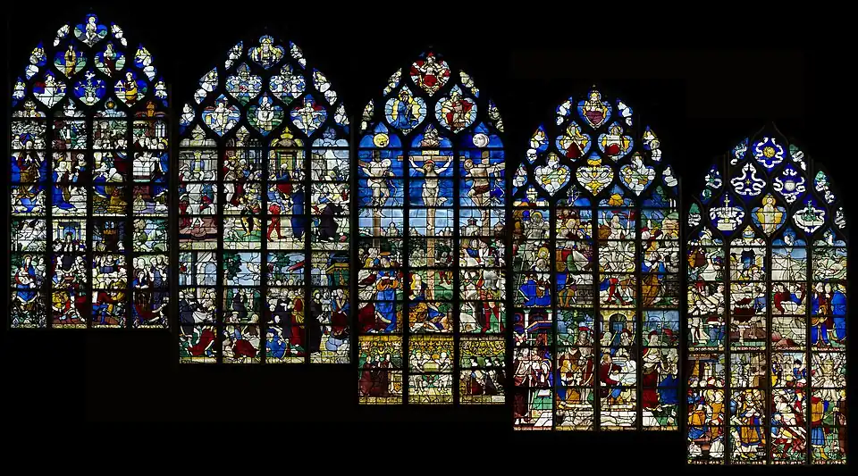 The stained glass windows come from the 16th century Church of Saint Vincent, whose ruins are located a few metres away. The old church was almost completely destroyed in 1944 during World War II, but the windows had been removed and stored in a safe location during the war. They were then incorporated into the Church of Saint Joan of Arc.[3] The 13 window panels depict Christ's childhood, Passion, Crucifixion and Resurrection, and life events of St.Peter, St. Anne and Saint Anthony of Padua:[5]