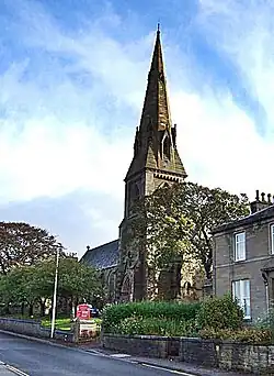 The church has a large oblong nave and north aisle with chancel and side chapel. The tower with lucarned spire is at the north-west of the nave and the spire is a prominent landmark on the skyline of the town. The materials are snecked masonry and slate. It was listed as Category B in 1971.[2] The rectory, also by Henderson, is separately listed as Category C.[3]