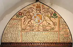 The Royal Arms on display in the chancel. W R for William but surmounted on the Arms of the deposed James II