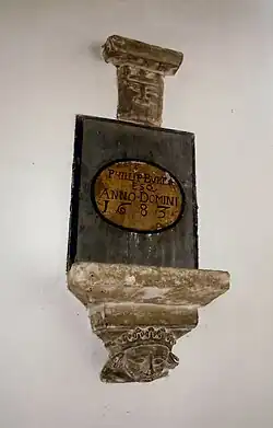 In the southwest corner of the nave can be found part of a 13th-century limestone marble slab, with an undeciphered inscription in Lombardic capitals along one margin. The communion rails were fitted at the bequest of William Meadston (died 1683). The door in the ground stage of the tower is formed of two leaves and is late-medieval, and originally was fitted in the west doorway. Prior to the restoration of 1880 there were two baptismal fonts in the church: one in the present position and one in the centre aisle. The present 13th-century font has an octagonal limestone marble bowl with two pointed arched panels in each face. The font's base has a cylindrical central pier with 19th-century peripheral shafts. The font's sub-base possibly incorporates the bowl of the earlier font which may well have been in use in the earliest church on this site.[4] The restored octagonal ogee font cover with crocketed ribs and finial is probably 16th-century.[1][2][4]