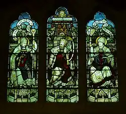 The two-light window at the east end of the north aisle represents Mary and Martha of Bethany, mentioned in Luke 38–42. In that story, Mary is interested in spiritual matters, whereas Martha prefers to do practical work. Thus Martha has a housekeeper's attributes of a spinning wheel and a purse at her waist, while Mary is praying and reading the Scriptures. This window is dedicated to Ann Mitchell, the village postmistress, by her husband.[15][23] The three-light window on the north aisle carries the theme of evangelism and music. It shows King David in the centre light, playing music. The left-hand light carries the words, "Their sound is gone out unto all lands," and the right-hand light says "and their words into the ends of the world." This is a translation of the 4th and 5th lines of Psalm 19, as it appears in the Book of Common Prayer: day 4, morning prayer. The men on either side of David are both saints with halos, and churchmen, wearing mitres. The dedication for this window is missing, but it was said by a local newspaper to have been given by William Clapham Cautley,[1] and that it is dedicated to George Thomas Woods of the Order of Saint John. Woods was church organist for 24 years.[15][23]